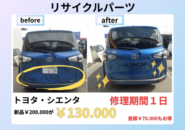 ナオイオートボディショップでは、お客様のニーズに応えるため、厳しい基準で選定したリサイクルパーツを使用し、コストを抑えつつも新車と遜色ない仕上がりを実現しています。