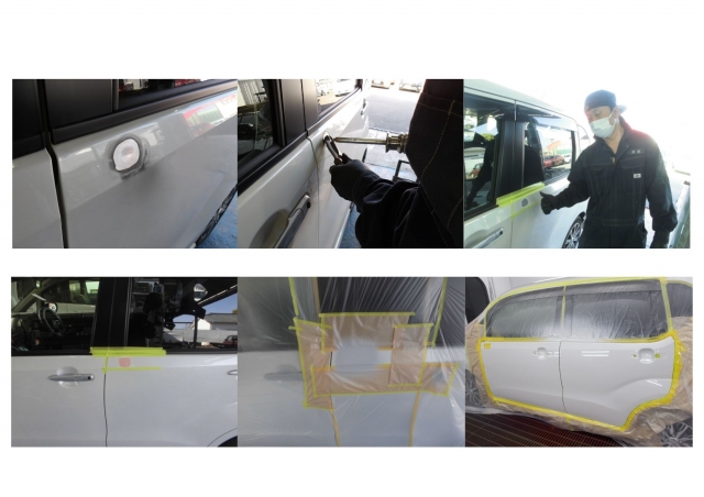 車庫にあった荷物がくずれて凹みでしたので色違いが出ないように隣接パネルに塗装をぼかしました。