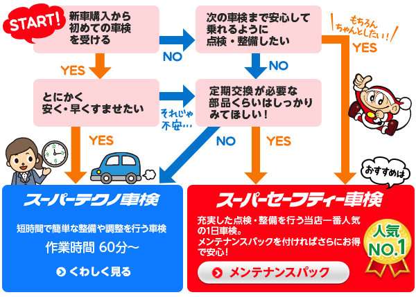 「スーパーテクノ車検」は短時間で簡単な整備や調整を行う車検です。