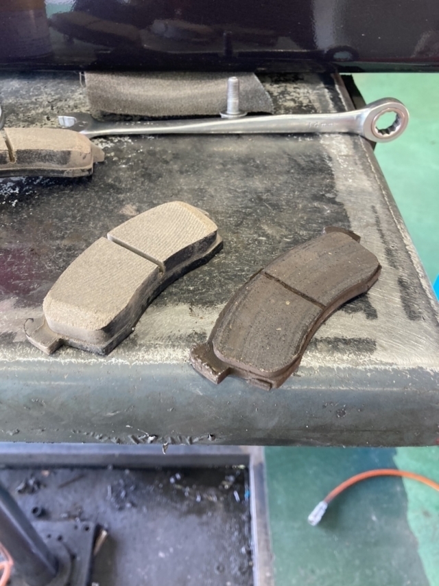 ブレーキパッドとは自転車に使われるブレーキと構造が同じでタイヤと一緒に回転しているディスクローターを挟み込んで車を停めています。新品は約10mmほどありますが、0mmになると最悪ブレーキが効かなくなってしまいます。特に残量が半分以下になると減りが早くなるため、コバックでは余裕をもって交換基準を約4mm以下でお勧めさせていただいております。