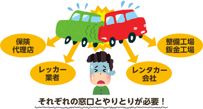 一般的な自動車保険にご加入の場合、事故が発生した場合に、保険会社・代理店や整備工場、レッカー業者それぞれの窓口と連絡が必要になります。