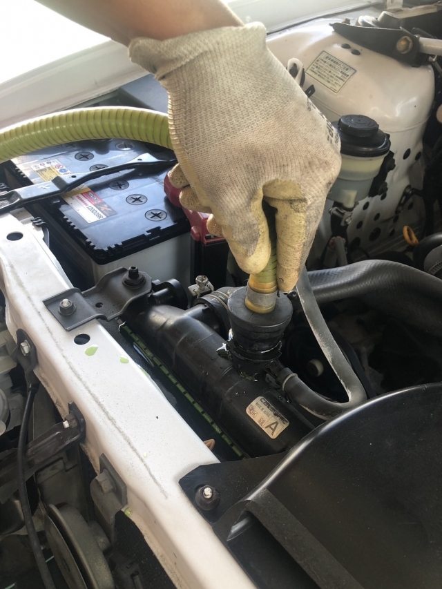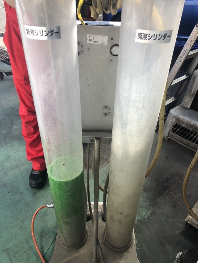 交換は専用機材を使って行い最後にサブタンクの入れ替えと漏れ確認を行い作業完了です。こちらの車はLLCの色がグリーンになります。