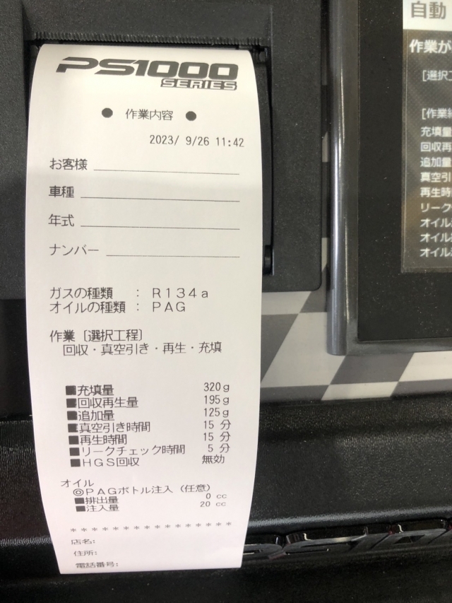 こちらのお車は規定量320gに対して125g減っておりました!さらにオイルも補充することで来シーズンに向け準備完了です。今年はエアコンを使う機会が多かったので1度点検されてはいかがでしょうか?