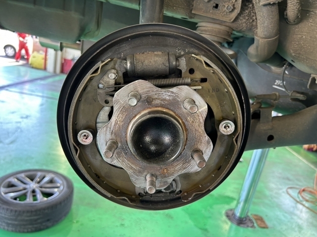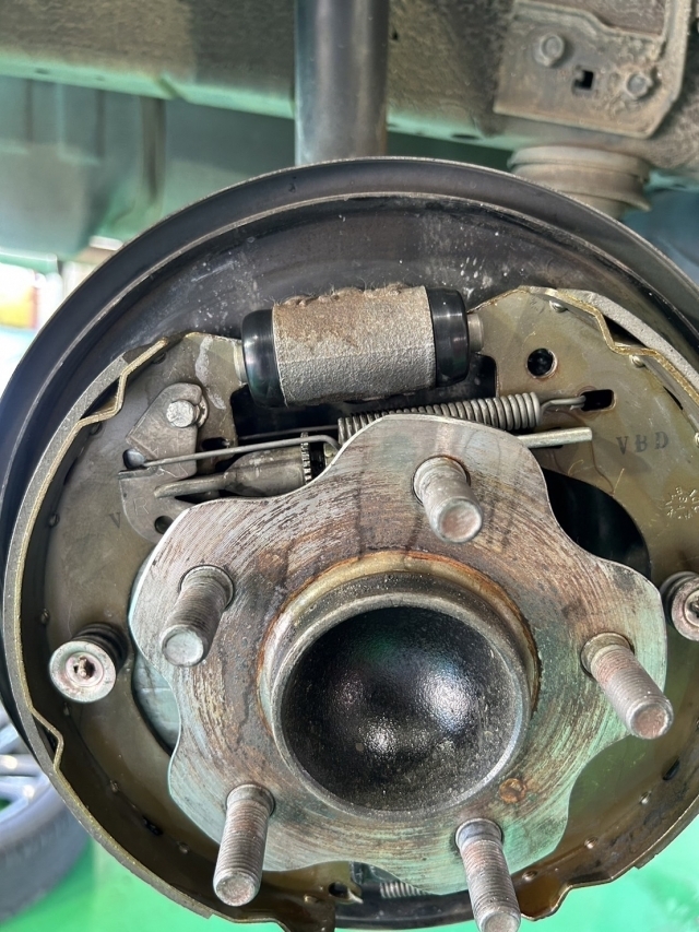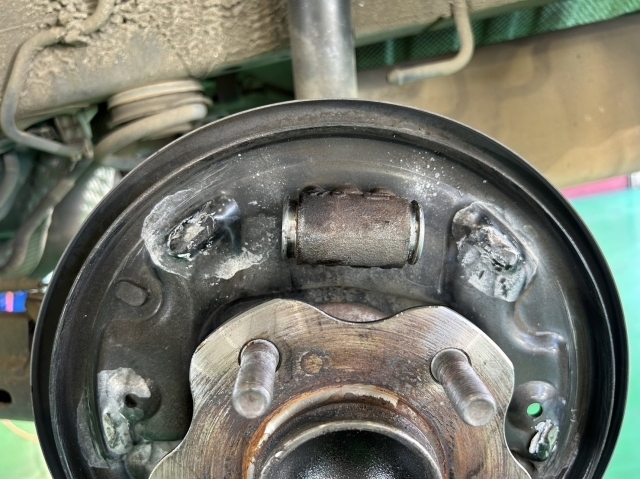 ホイールシリンダーという部品のオーバーホールになります。年式、走行距離、使用状況によって変わりますが、劣化するとブレーキを踏むとこちらの部分からオイルがにじみ出る→ブレーキに伝わる力が弱くなる→ブレーキの効きが悪くなる。最悪の場合ブレーキが効かなくなります。ですから、少々でもにじみがある場合は車検不合格となり交換が必要です。