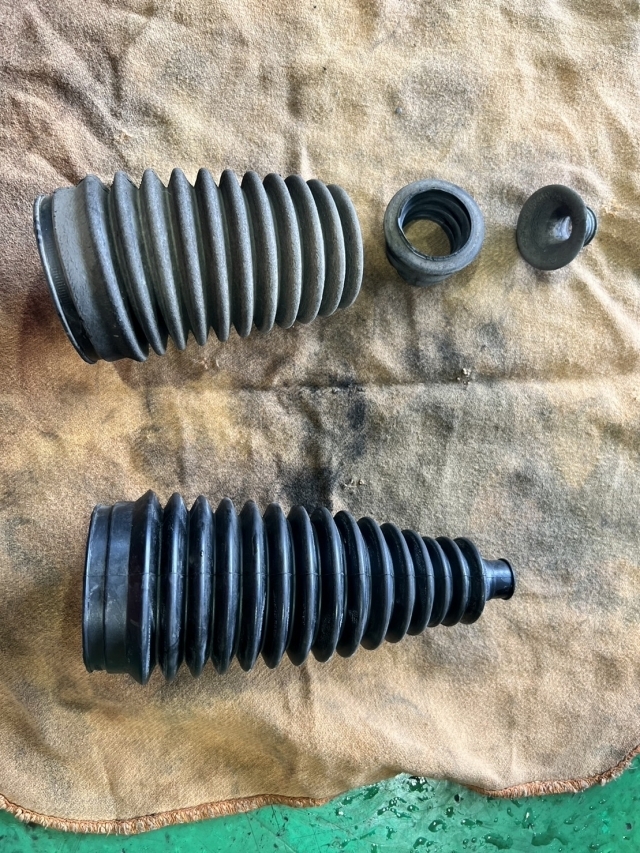 この部品はハンドルと連動して動く「ステアリングギアボックス」の部品でして両端にある「ラックブーツ」というゴム製のカバーの重要な部品です。この部分が破けていると、水や砂が入ることでサビやガタつきが発生して最悪はハンドル操作不能となってしまうこともある大切な部品です。そのような観点から車検不合格となります。