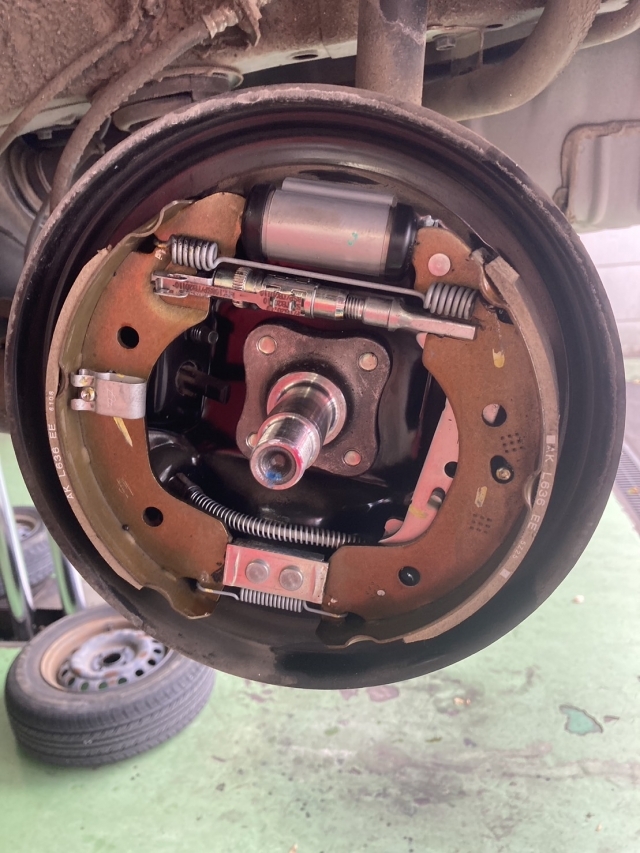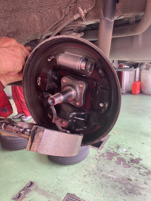 ホイールシリンダーという部品のオーバーホールになります。年式、走行距離、使用状況によって変わりますが、劣化するとブレーキを踏むとこちらの部分からオイルがにじみ出る→ブレーキに伝わる力が弱くなる→ブレーキの効きが悪くなる。最悪の場合ブレーキが効かなくなります。ですから、少々でもにじみがある場合は車検不合格となり交換が必要です。