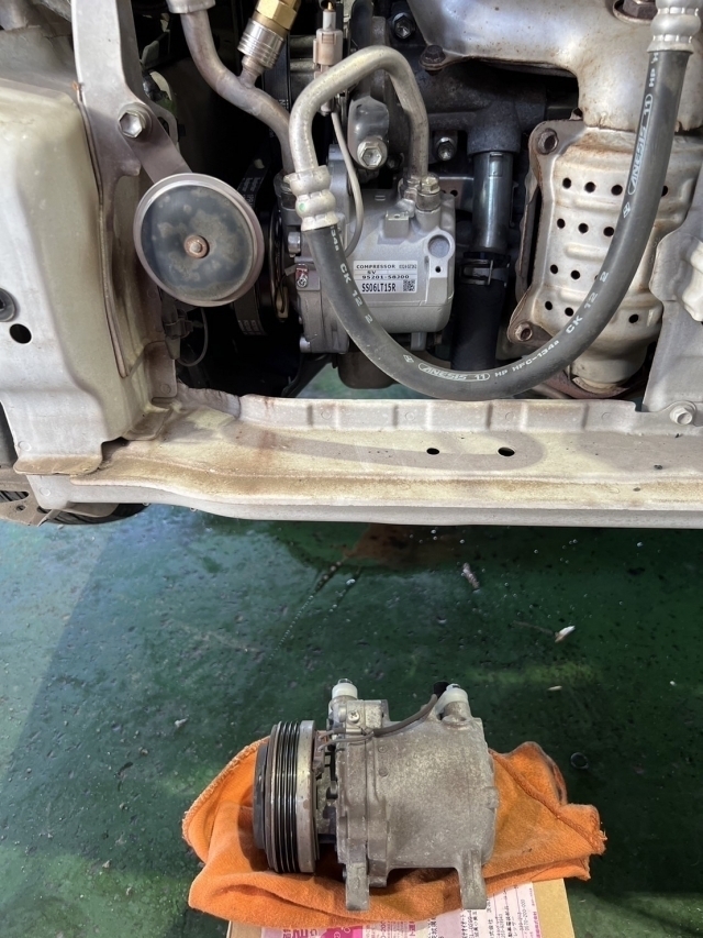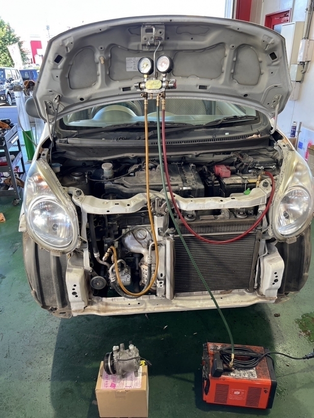 専用のテスターを用いて診断した結果、コンプレッサー交換を提案させていただきました。今後のカーライフをお客様と相談して作業を進めさせていただきました。