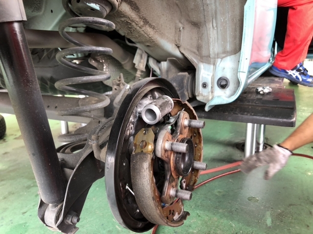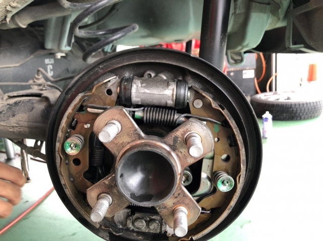 ホイールシリンダーという部品のオーバーホールになります。年式、走行距離、使用状況によって変わりますが、劣化するとブレーキを踏むとこちらの部分からオイルがにじみ出る→ブレーキに伝わる力が弱くなる→ブレーキの効きが悪くなる。最悪の場合ブレーキが効かなくなります。ですから、少々でもにじみがある場合は車検不合格となり交換が必要です。