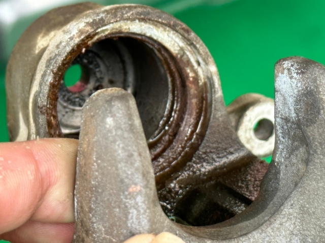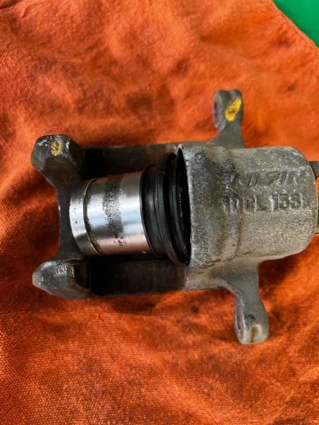 ブレーキキャリパーという部品のオーバーホールになります。年式、走行距離、使用状況によって変わりますが、劣化するとブレーキを踏むとこちらの部分からオイルがにじみ出る→ブレーキに伝わる力が弱くなる→ブレーキの効きが悪くなる。最悪の場合ブレーキが効かなくなります。ですから、少々でもにじみがある場合は車検不合格となり交換が必要です。