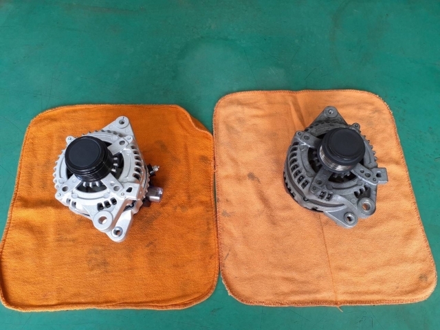 今回の修理では「リビルト品」のオルタネーターを手配させていただきました。ちなみに「リビルト品」とは廃車になった車から利用可能な部品を再利用したもので必要な修理をしてから検査基準に合格した部品になります。リビルト品を使うことで新品よりも半額以下の値段で交換することができます。