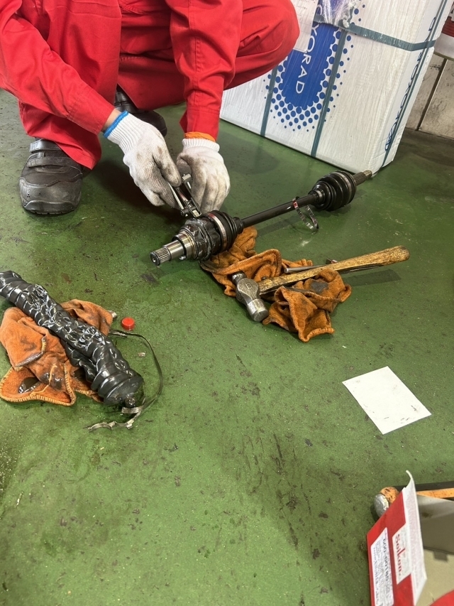 この部品はエンジンの力をタイヤまで伝えるドライブシャフトに付いている重要な部品になります。内部に水や砂が入らないようにするゴムのカバーです。画像の様に破れてグリスが出た状態のまま使用していると最悪の場合、走行できなくなる恐れがあり車検不合格となります。今回はハンドルを切って走り始める時に「カリカリ」という音が出ていないとのことでしたのでゴム部品だけの交換となります。