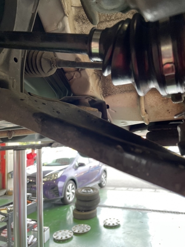 全ての車には『車検不合格になる部品』として『ブーツ』と呼ばれるゴム部品が多く使われてます。今回の車検では『ドライブシャフトブーツ』を交換させていただきました。