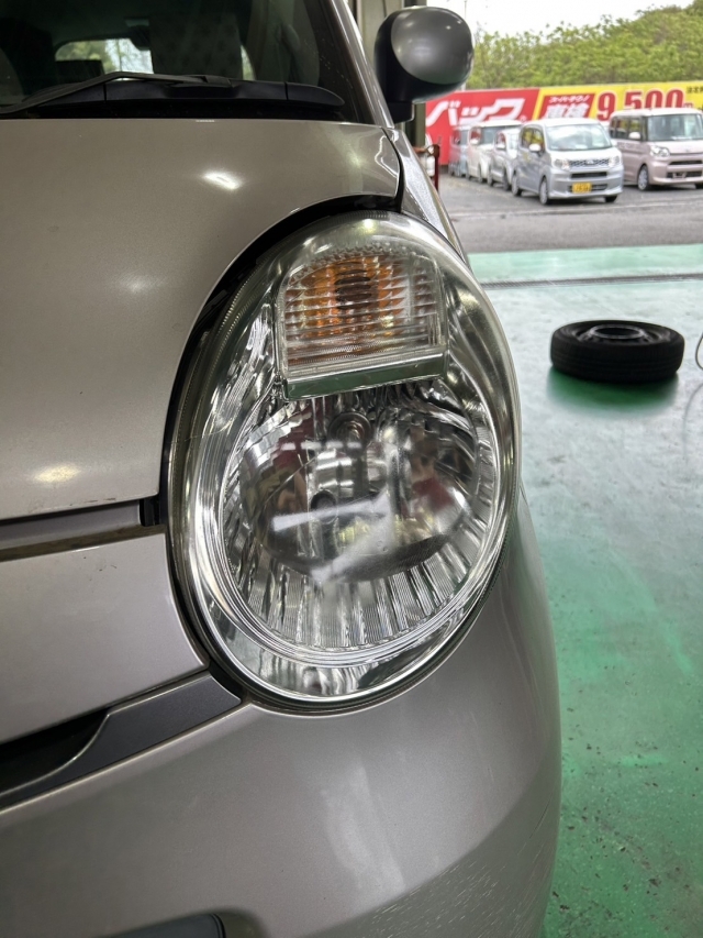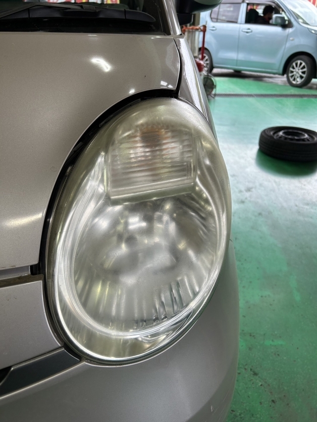 ヘッドライトが黄ばんでおり、光量が不足しておりましたのでヘッドライトクリーニングを施工させていただきました。そもそも黄ばみの主な原因は紫外線の影響です!レンズ部分は「ポリカーボネート樹脂」という素材でガラスよりもずっと耐久性に優れていますが、紫外線に弱く年月と共に黄ばみ・くすみが目立ってきます。また走行中の細かな飛び石による傷や、排気ガス・油汚れなども黄ばみやくすみの原因となっています。