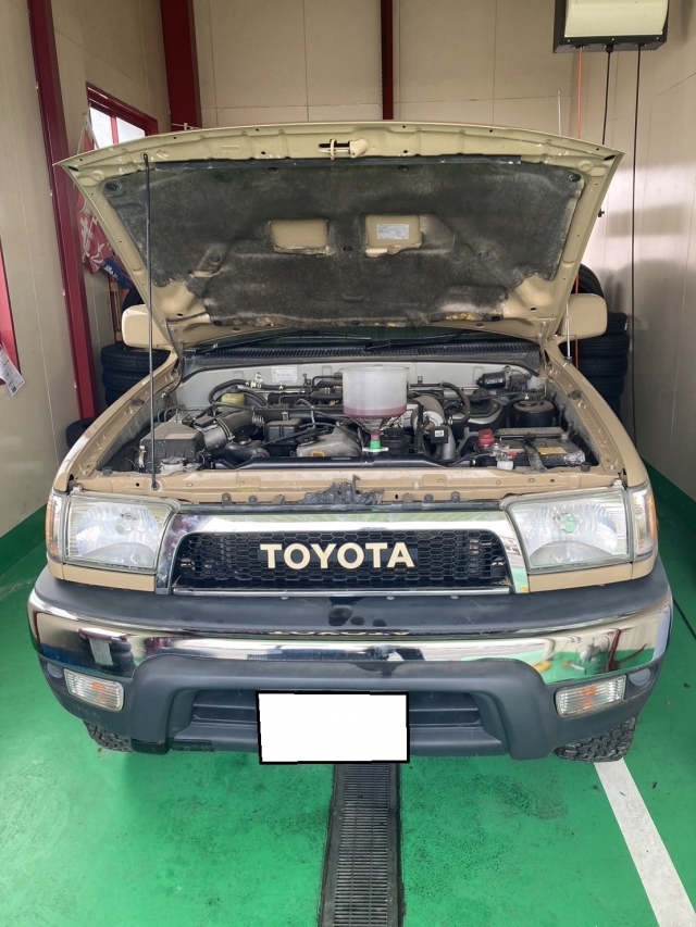 本日はトヨタ「ハイラックスサーフ」(GF-RZN185W)の修理と整備を実施させていただきました。年式が1999年、走行距離が12万キロでの入庫となります。