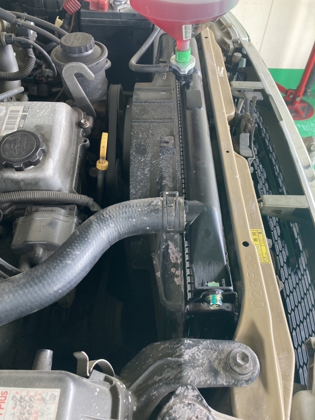 冷却水が減った状態で使い続けるとオーバーヒートやエンジンの故障へと繋がってしまいます。そうなると高額な修理金額も予想されます。今回はラジエーターのみを交換して最後に冷却水のエア抜きと漏れ確認を行い作業完了です。