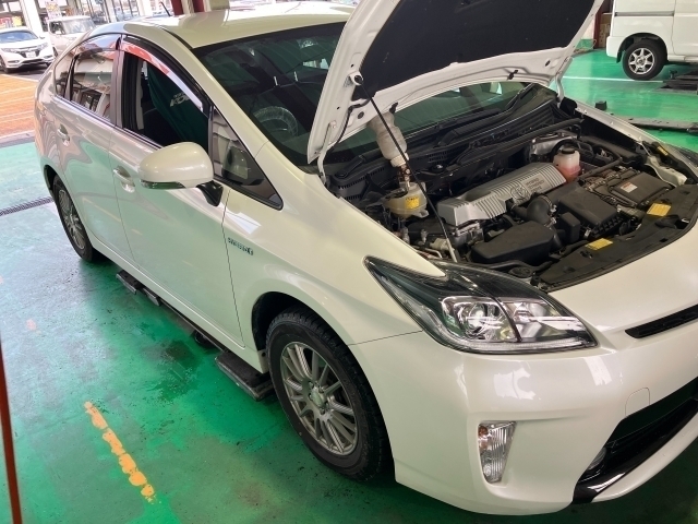 本日はトヨタ「プリウス」(DAA-ZVW30)の車検と整備を実施させていただきました。年式が2013年になります。