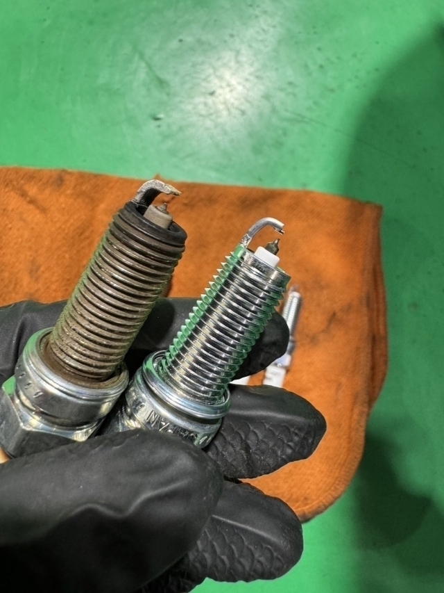 スパークプラグとは、エンジン内部に吸気された混合気(空気とガソリンが混ざった気体)に、火花を散らして発火させる役割をしています。 しかしながら、エンジン内部の燃焼室での過酷な状況下では、プラグの電極も燃焼による衝撃で、少しづつ減っていきます。 電極の角がとれ、丸みを帯びてくると火花が飛びにくくなり、失火の原因になり定期的な交換が必要です。