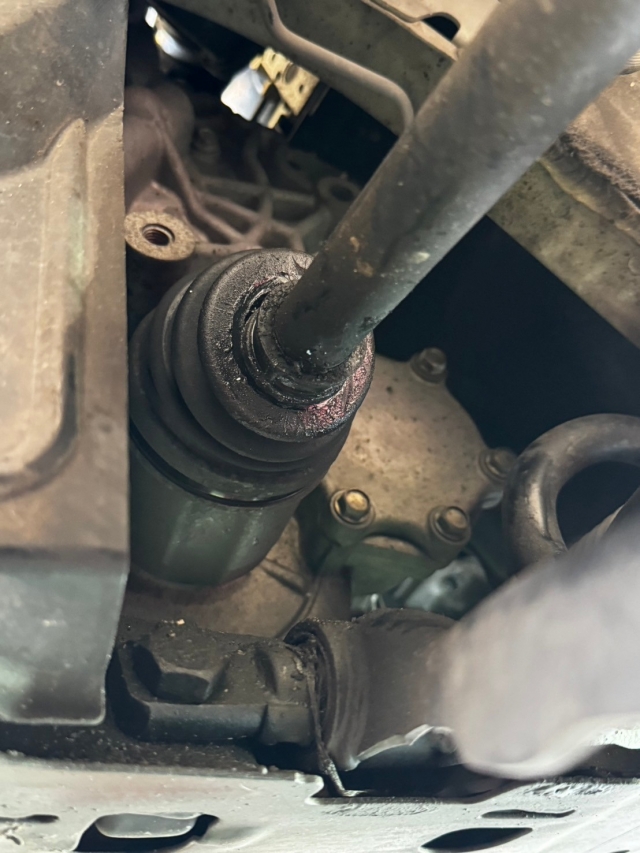 この部品はエンジンの力をタイヤまで伝えるドライブシャフトに付いている重要な部品になります。内部に水や砂が入らないようにするゴムのカバーです。画像の様に破れてグリスが出た状態のまま使用していると最悪の場合、走行できなくなる恐れがあり車検不合格となります。今回はハンドルを切って走り始める時に「カリカリ」という音が出ていないとのことでしたのでゴム部品だけの交換となります。