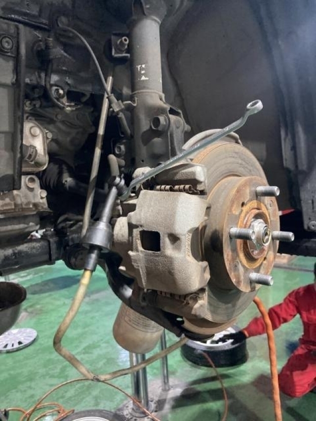 ハンドルを切ってご自身で点検することもできます。タイヤの内側に付いている大きな蛇腹のゴムブーツです。破けている際は早目にご相談ください。