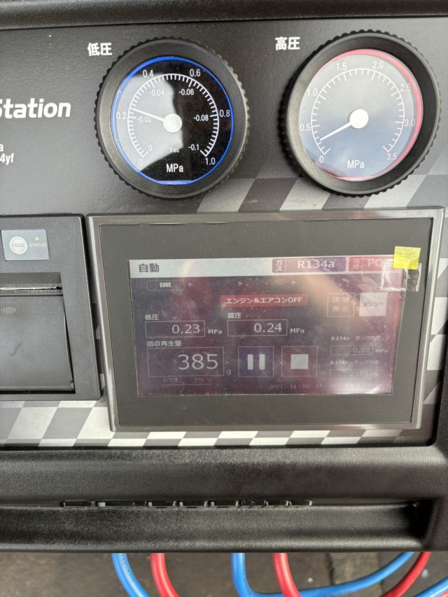 現在主流の冷媒ガス=HFC-134aは圧力ではなく、グラムで調整作業が必須です。そこで注目を集めているのが『エアコンガスのクリーニング』です!これは専用の機械を使って冷媒ガスを真空引きですべて吸い出して冷媒ガス中の水分や不純物を取り除き適正量を入れ直すという作業が可能となりました。