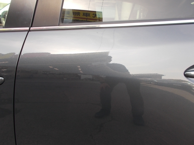 左リアドアの中央より少し前のプレスライン上に15cmほどの凹み、