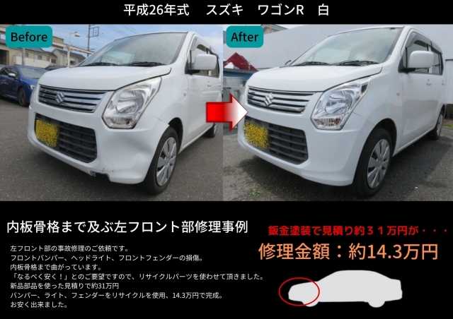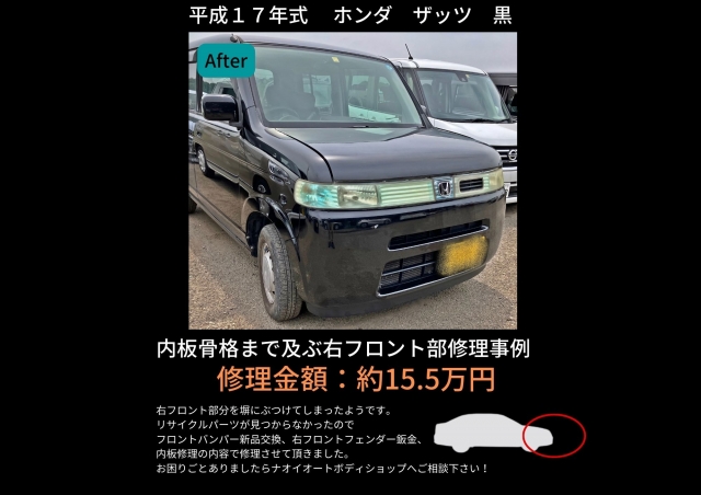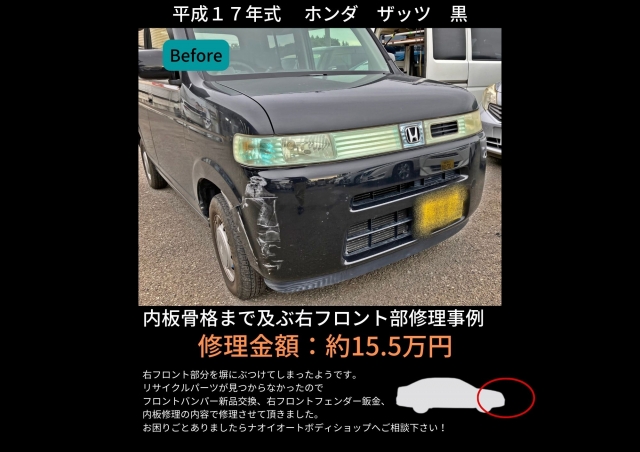 フロントバンパー新品交換、右フロントフェンダー鈑金、内板修理の内容で