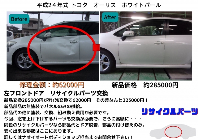 同色のリサイクルパーツなら部品代とドア脱着、部品の付け替えのみ。