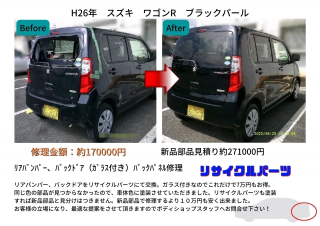 同じ色の部品が見つからなかったので、車体色に塗装させていただきました。リサイクルパーツも塗装すれば新品部品と見分けはつきません。新品部品で修理するより10万円も安く出来ました。