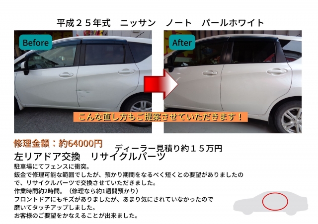 鈑金で修理可能な範囲でしたが、預かり期間をなるべく短くとの要望がありましたので、リサイクルパーツで交換させていただきました。