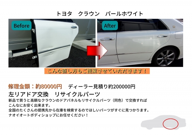 新品で買うと高額なクラウンのドアパネルもリサイクルパーツ(同色)で交換すれば