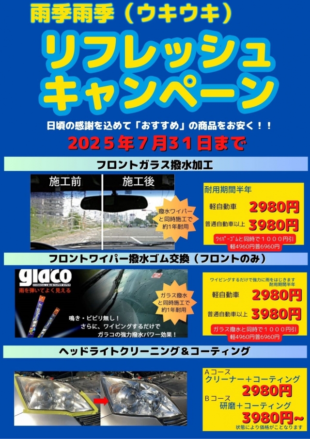 ナオイオート ボディショップでは、お客様の愛車の美しさと安全を同時に叶える「ヘッドライト&撥水ガラスコーティングキャンペーン」を実施中です。 車の印象を大きく左右するヘッドライトのくすみや黄ばみ、そして雨の日の視界不良にお悩みではありませんか?この機会に、プロの技術で新車のような輝きとクリアな視界を手に入れましょう! くすみ・黄ばみ解消!ヘッドライトコーティング 長年の使用や紫外線によって、車のヘッドライトは徐々にくすんだり、黄ばんだりしてしまいます。見た目の劣化はもちろん、夜間の視認性低下にも繋がり、安全運転にも影響を及ぼしかねません。 ナオイオートのヘッドライトコーティングは、専用の下地処理剤で表面の劣化層を徹底的に除去し、その上から耐久性の高い専用コーティング剤を塗布します。 新車のような輝きを取り戻す!: 透明感とツヤが復活し、車の印象が格段にアップします。 夜間の視界がクリアに!: 光量が回復し、暗い道での視認性が向上。安全運転をサポートします。 コーティング剤が汚れの付着を軽減させます 雨の日の運転が快適に!撥水ガラスコーティング 雨の日の運転は、視界が悪くなりがちで、ドライバーにとって大きな負担です。フロントガラスに水滴がベタッと広がり、ワイパーを動かしてもギラつきが気になる…そんな経験はありませんか? 当社の撥水ガラスコーティングは、高い撥水効果で雨粒を弾き飛ばし、クリアな視界を確保します。 抜群の撥水効果!: 雨が降っても水滴がコロコロと流れ落ち、視界が常にクリアに保たれます。 油膜や汚れが付きにくい!: コーティング被膜が汚れの固着を防ぎ、日常のお手入れが格段に楽になります。 凍結しにくい!: 冬場のフロントガラスの凍結を軽減し、朝の時短にも貢献します。 耐久性が向上!: 高品質なコーティング剤を使用することで、効果が長期間持続します。 ナオイオート ボディショップでは、お客様のニーズに合わせた最適なコーティングプランをご提案いたします。ヘッドライトのくすみや黄ばみが気になる方、雨の日の運転をより安全に快適にしたい方は、ぜひこの機会に当社のコーティングサービスをご利用ください。 キャンペーン期間中は、特別価格でご提供しておりますので、お見積もりだけでもお気軽にお問い合わせください。愛車のプロフェッショナルが、お客様のご来店を心よりお待ちしております! キャンペーン詳細とお問い合わせ https://naoiauto.jp/repair/ https://naoiauto.jp/repair/ Instagram https://www.instagram.com/naoibodyshop/ #ナオイオート#ボディショップ#ヘッドライトコーティング#ガラスコーティング#撥水コーティング#カーコーティング#茨城洗車#愛車ケア#車の輝き#視界クリア#鈑金塗装#茨城#ひたちなか市#水戸市#筑西市#下館市#下妻市#常総市#坂東市#守谷市#つくばみらい市#取手市#龍ヶ崎市#牛久市#つくば市#土浦市#かすみがうら市