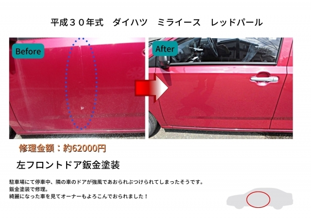 駐車場にて停車中、隣の車のドアが強風であおられぶつけられてしまったそうです。