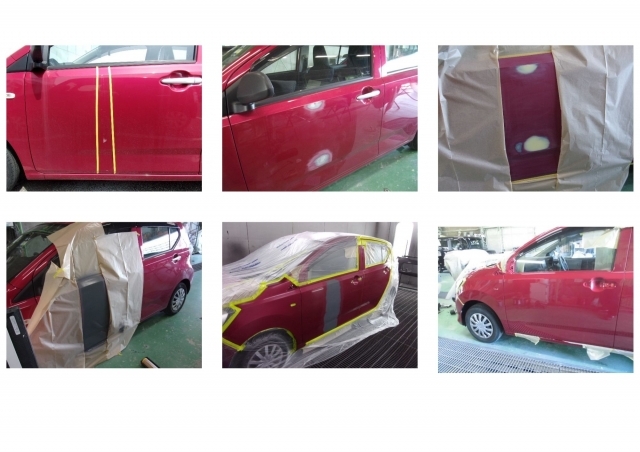 車庫にあった荷物がくずれて凹みでしたので色違いが出ないように隣接パネルに塗装をぼかしました。