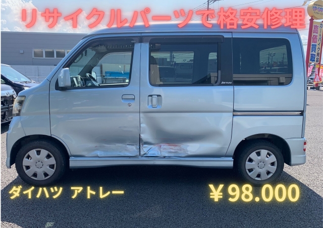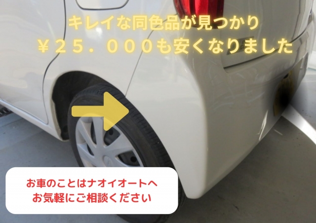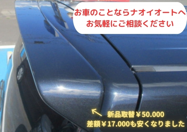 そこでナオイオートでは、お客様と相談の上、色や状態の合った高品質なリサイクルパーツを探し、予算金額内でリサイクルパーツで交換修理を行いました。