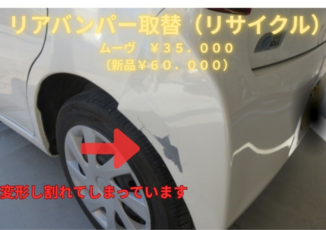 今回の事例では、ダイハツムーヴのリアバンパーの修理にリサイクルパーツを使用しました。新品パーツと比較して大幅なコストダウンを実現しながらも、 遜色のない美しい仕上がりとなっています
